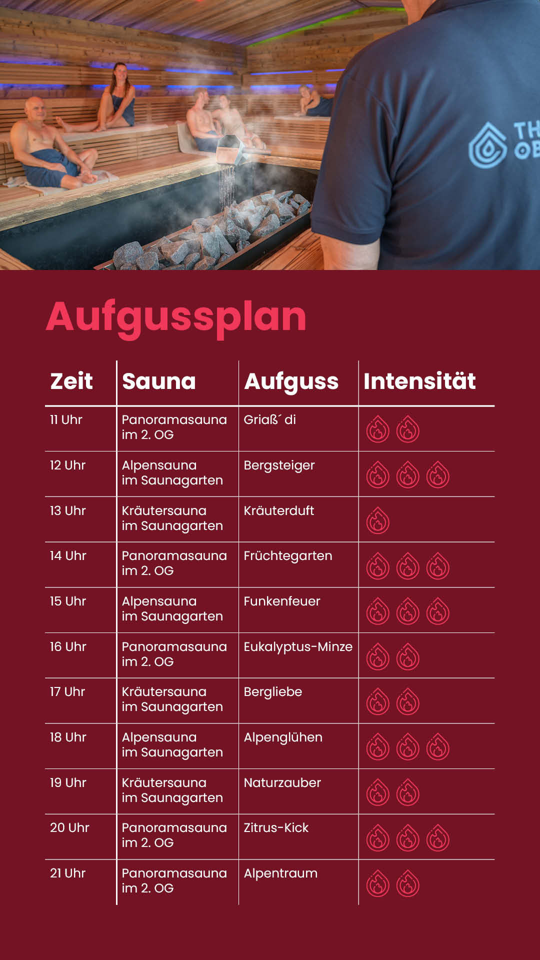 Ideal für alle Fans von intensiven Saunagängen und uneingeschränktem Bergpanorama. Sorgfältig ausgewählte Aufgüsse regen die Durchblutung an und bringen den Stoffwechsel so richtig in Schwung.