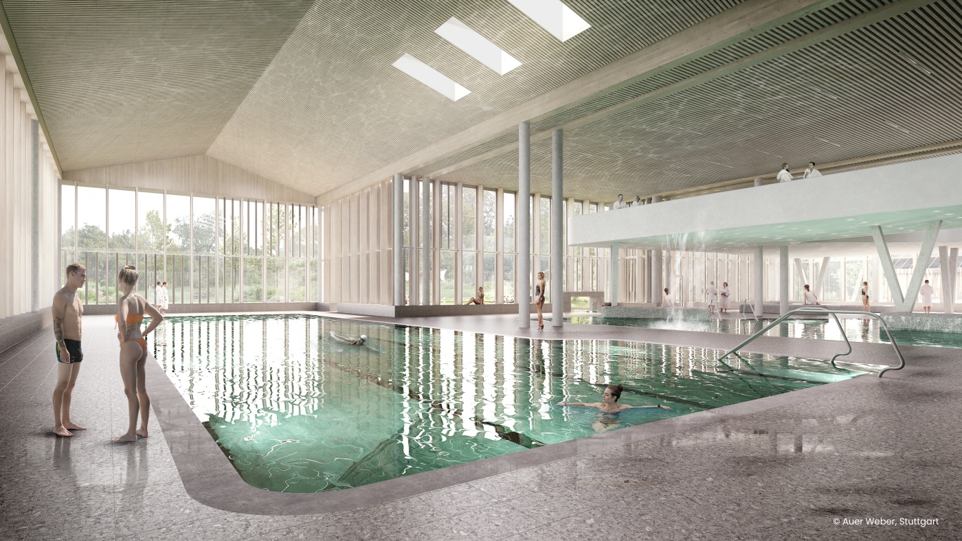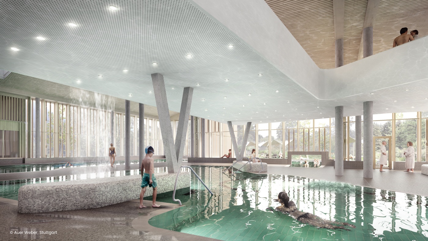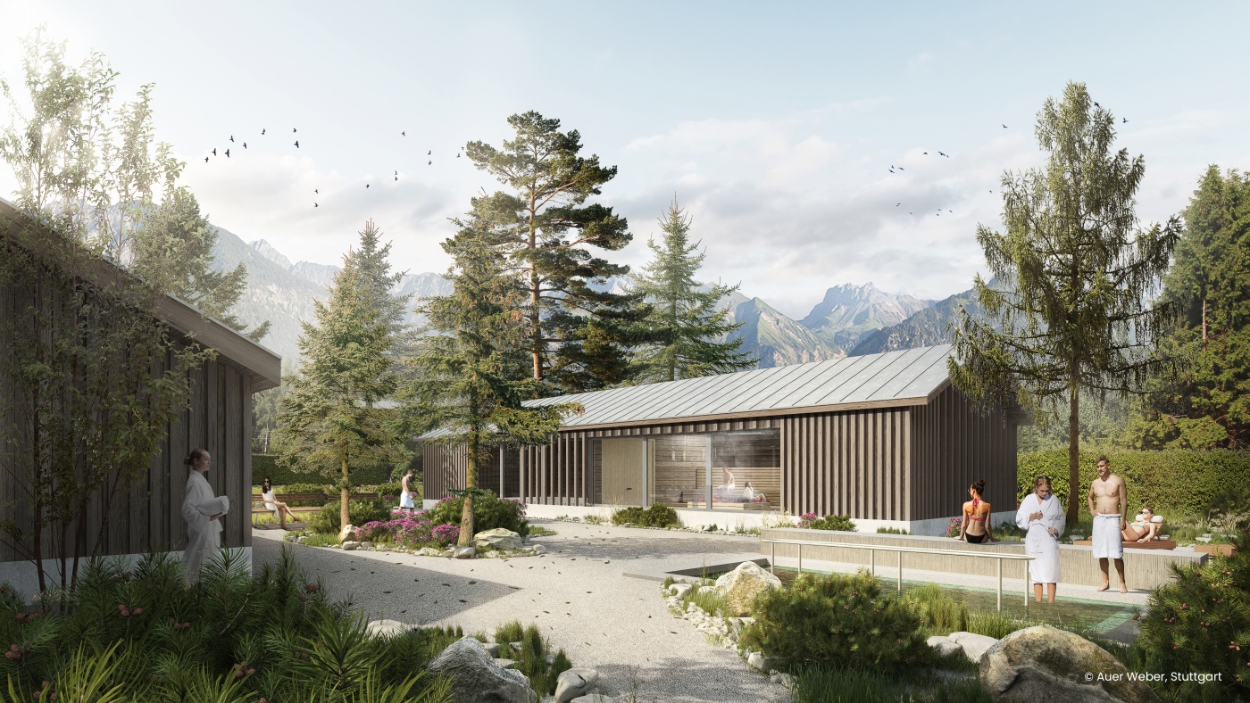 Die Verwendung der Renderings der Therme sind ausschließlich unter der Benennung des Copyrights Auer Weber, Stuttgart in einem zur Therme Oberstdorf passenden Kontext zulässig. Weitere Bilder der Therme und dem künftigen Angebot erfolgen nach Baufertigstellung.